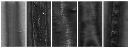 The VGG16 model is employed for TL. The pre-trained model comes from the ImageNet dataset, the world’s largest database for image recognition, containing 15 million images and covering the images of all objects in life [53]. The image data in this work come from the steel plate production line of an actual factory. The laser welding of carbon steel plates and stainless steel plates is studied and the appearance of these two types of steel plates is inconsistent under the definition of the same defect type. Affected by the change in welding environment, various welding defects will be produced in laser welding. A total of 1030 original steel plate weld images were collected by an industrial camera, visual light source and laser welding machine tool. Each original weld image is 5 million pixels and each original weld image contains various defects. We mixed all these asymmetric image data. Five different types of weld images can be obtained by cutting the original image. Figure 6 illustrates the detailed information of some images. From left to right were flawless, cracks, lack of fusion, lack of penetration and gas pores.