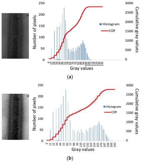 In Equation (3), is the gray value after transformation, is the gray value before the transformation, a is the lowest gray value before the transformation and b is the highest gray value before the transformation. The value 127 represents the median value of the difference between the highest pixel value and the lowest pixel value, which is calculated as a fixed constant.