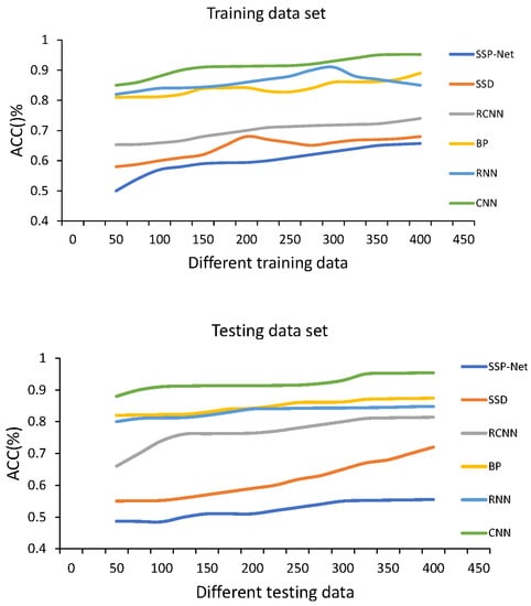 Accuracy (ACC) is the comparison indicator of model performance evaluation, representing the proportion of processed samples correctly classified as positive samples [54]. The calculation of ACC is Equation (8), where is the number of correctly predicted defect images and is the number of actual defect images. The algorithms selected include Spatial Pyramid Pooling Networks (SPP-Net), Single Shot MultiBox Detector (SSD), Region-CNN (RCNN), CNN, BPNN, and Recursive Neural Networks (RNN), totaling six algorithms for comparative analysis.