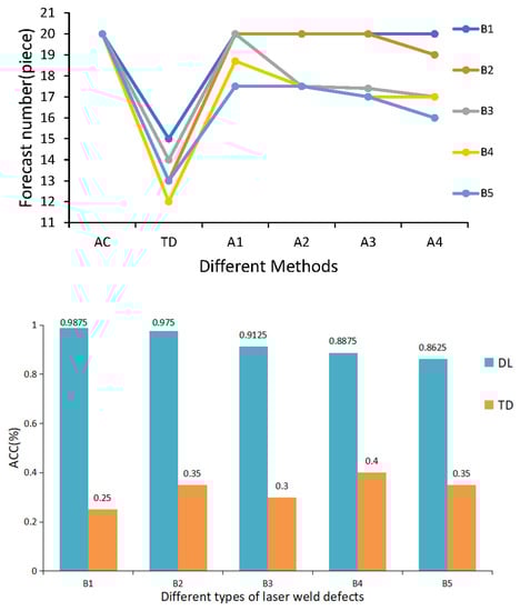 Comparative experiment of industrial weld defect images. AC represents the original number of steel plates; TD represents the results of using traditional machine learning algorithms; A1–A4 represent the results using the VGG16 model for sufficient training, 12-layer training, 123-layer training and 1234-layer training, respectively; B1–B5 represent practical problems such as pores, cracks, lack of fusion, lack of penetration and flawless.