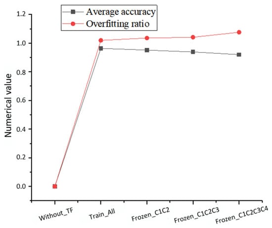 The average accuracy and over-fitting ratio of 250 iterations of the model in various experimental methods are shown in Figure 11; without_TF directly uses the first VGG16 model without training ImageNet datasets or learning how to migrate. Train_All means to create the VGG16 model and improve all training and network parameters of different layers without freezing the model through sufficient data training and migration training. Frozen_Cx represents an experimental method that freezes the fine-tuning model of X-layer training parameters of the heterogeneous migration model. The analysis in Figure 11 is a migration recognition task of the image dataset for the weld defect detection. The without_TF method lacks enough data to train the model, the extraction ability and feature representation are relatively low, the recognition efficiency is low, there is a serious over-fitting problem, the performance is poor, and it has not been calculated.