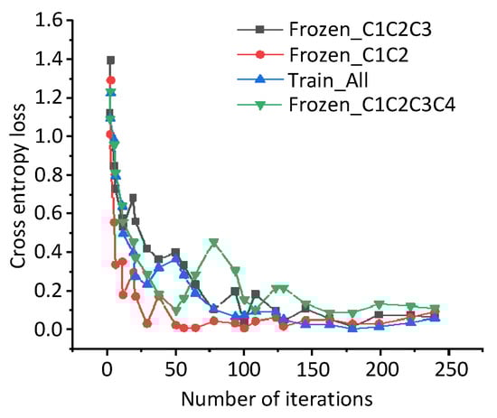 Figure 12 shows the results of cross-entropy loss under different iteration times. When the source domain model features and training parameters are fully mounted to fine-tune the entire model, the learning ability of the target domain will be rapidly improved. Since the adjustment process from the beginning to the end gradually refines the underlying features of the original input, the feature expression ability between layers is more vital. In that case, the abstract features of the image can be better integrated, presenting better results. The more frozen convolutional layers there are, the lower the accuracy of the model, and the higher the over-fitting ratio of the model.