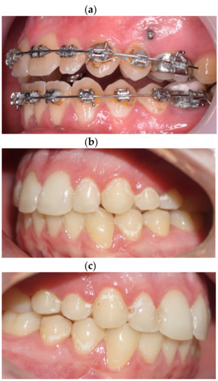 The main side effects of orthodontic treatment and poor oral hygiene during orthodontic treatment (a) plaque accumulation sites around orthodontic braces, (b,c) white spot lesions, enamel demineralization, and cavity occurred due to fixed orthodontic treatment.