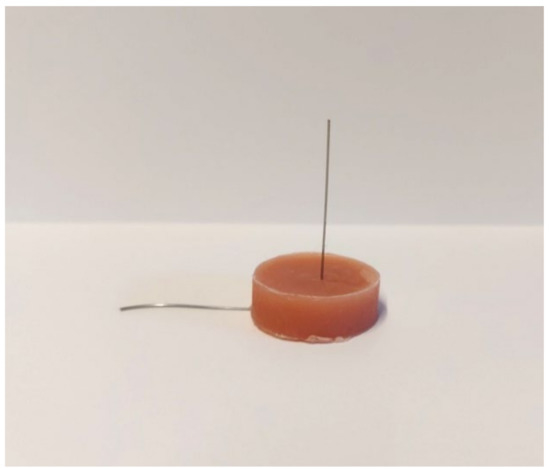 In order to prepare samples for electrochemical tests, selected parts of archwires were mounted in the Duracryl Plus epoxy resin according to the scheme below (Figure 2). For the next step, each working surface was cleaned with acetone in an ultrasonic bath.