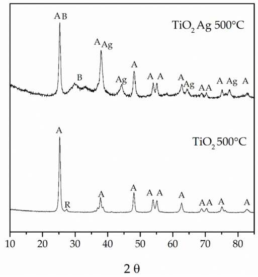 X-ray diffraction analysis of the powders presented in Figure 4 shows patterns of the above-mentioned TiO2 and TiO2 modified with Ag, both calcined for 2 h at 500 °C. A, B, R, Ag correspond to anatase, brookite, rutile, and silver phases, respectively. For the base TiO2 powder, we observe peaks referring to the anatase phase with the main diffraction peak at 2Θ = 25.25. The temperature of 500 °C, which was used for calcination suffices to start the rutile phase crystallization, as evidenced by the diffraction peak at 2Θ = 27.35. The XRD pattern of the modified powder shows no signs of rutile crystallization; on the other hand, we observed a hump located at 2Θ = 31° which refers to the brookite peak. Main brookite peaks are located near 2Θ = 25° and are covered by anatase peaks. Another difference between the powders is the intensity of the peak near 2Θ = 38°, which, apart from the anatase phase, may refer to the main peak of metallic silver. There are also new peaks at 2Θ = 43.5, 64.3, and 77.25, which directly confirmed the presence of metallic silver in the powder.