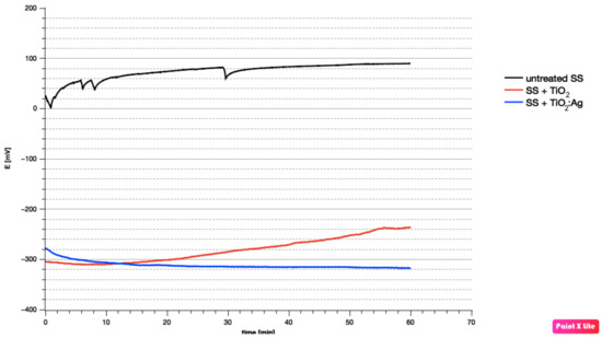 Open-circuit potential measurements (OCP) performed after 1 h are shown in Figure 5. The curves show the potentials versus time of the selected untreated stainless steel archwires and stainless steel archwires with a modified surface. The obtained results for bare SS samples show that the potential EOCP increased suddenly. This indicates the passivation of this material, which can also be seen at the next stage of electrochemical tests. Furthermore, the continued shift of potential to positive values indicates that there were changes in the passive layer [24,25]. The potential equals about −300 mV vs. SCE compared to specimens of archwires with coatings, which can be evaluated as the initiation of localized corrosion or tendency to corrode. However, subsequent investigations revealed that these potential decreases might be related to cathodic inhibition [26]. Moreover, a shift of EOCP towards positive values also for a SS archwire sample with a TiO2 layer was observed. It indicates that this specimen could also form a passive oxide layer.