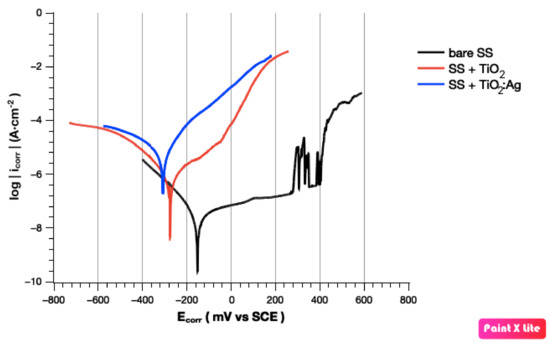 Potentiodynamic polarization curves of bare, TiO2 coated and Ag-doped TiO2 coated selected samples.