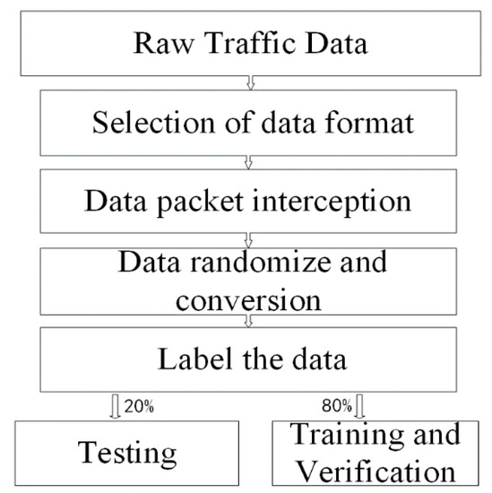 The data preprocessing converts the raw traffic into an input format that the neural network can use. As shown in Figure 2, it includes four steps: selection of data format, data packet interception, data randomizing and conversion, and data labeling.