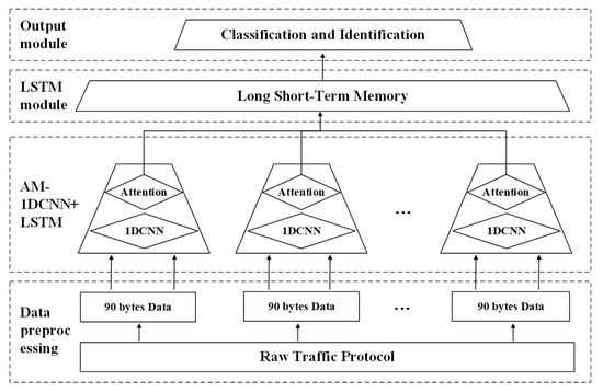 Current methods for ICS network protocol identification are the same as application-layer protocol identification [2]. They can mainly be divided into rule-based methods and methods based on machine learning [3]. The former includes port-based, payload-based, deep packet inspection (DPI), etc. These methods are manually configured based on empirical knowledge, and then deep decoding and feature matching are performed at L2–L4. In addition to the previous layer analysis, DPI adds application layer analysis to identify protocols which are simple and easy to deploy. However, the methods cannot identify the protocols of encrypted and unknown traffic. The latter include machine learning (ML) and deep learning (DL) methods. They use optimization engines to increase accuracy and can automatically fit new patterns. The methods mainly include algorithms such as support vector machine (SVM), random forest (RF), and K nearest neighbor (KNN). However, the performance of the ML-based method depends mainly on the features of the manual design. It limits the universality of the ML-based method. Especially in unknown protocols, features are difficult to extract. Deep learning methods have avoided the disadvantages of ML methods. Deep learning methods do not need to use professional knowledge to design data features. In contrast, they have a fair ability to learn these highly complex patterns. Now, methods based on deep learning have been the most popular traffic identification techniques [4]. However, the common application-layer protocol identification methods mainly focus on multimedia traffic, internet application software protocols, etc. Unlike Internet protocols, the ICS traffic is periodic and stable and has a relatively shorter payload. Therefore, we can take advantage of the symmetry between the Internet-oriented and the ICS-oriented identification methods. The asymmetry between the structure and characteristics of both is then exploited to design identification methods suitable for ICS traffic. It does not directly transplant Internet-oriented methods to the ICS protocol identification [5]. Aiming at this problem, we propose a preprocessing method and a deep learning model of protocol identification based on the raw ICS traffic payload. For ICS raw traffic preprocessing, the proposed method combines ICS traffic data sequence characteristics and data structure distribution to build four preprocessing steps. The DL model refers to automatic learning and effective feature representation of data. The proposed model utilizes attention mechanism (AM), one-dimensional convolutional neural network (1DCNN), and long short-term memory network (LSTM) to learn high-level data representations of raw data. The network model extracts high-level features from the sequence structure of space and time. The proposed model is implemented and then an experimental evaluation is based on the ICS traffic data. The results demonstrate the superiority of the proposed model in the identification of the ICS protocols.