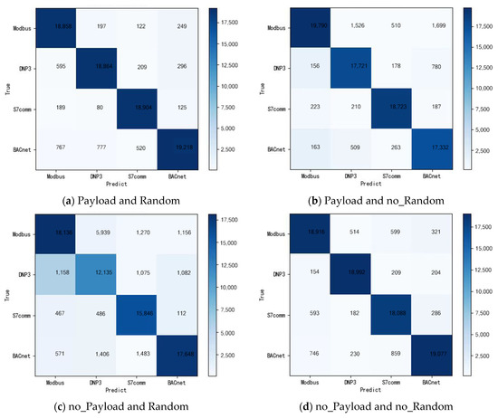 From the results in Table 1, the accuracy of Scenario 1 is 12% higher than Scenario 3. Moreover, the identification accuracy of payload data is higher than those without payload, at least 3% higher. The result shows that part of the payload data can improve the accuracy of classification and identification. However, it can also be seen that the accuracy of Scenario 4 is reduced by 13% compared with Scenario 3. After randomizing the raw data header part of the data in the experiment, the identification accuracy has decreased. The above results confirm our preprocessing method at the data randomize and conversion part. Because the raw data has only fixed device IP and MAC, it leads to a one-to-one correspondence between the MAC address, the IP address, and the various protocols, which positively affect identification. However, the MAC address, IP address, and other raw data information we get come from completely different devices in the real industrial control environment. Therefore, to be more real and close to a real ICS environment, this experiment is designed to randomize features such as MAC and IP. Figure 6 is the confusion matrix of the identification results of the model under the four scenarios, a more intuitive display.