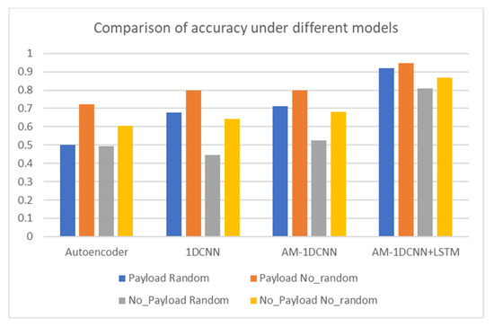 It can be seen from Figure 7 that there are obvious differences in the experimental results under different models and different scenarios. In the two scenarios that include a payload, the randomization processing under the Autoencoder model has a greater impact on the experimental results. It leads to a 30% difference in the results of the two scenarios. The reason is that the randomization destroys the coding structure of the data to decrease the feature extraction ability of Autoencoder. The identification accuracy of 1DCNN and AM-1DCNN under this scenario has been improved compared with Autoencoder. However, when the payload is not included and randomized, the accuracy of the three models is at a low level and can only reach an accuracy of about 50%. When the payload is included and not randomized, the first three models can achieve 70–80% accuracy. Compared with the model mentioned above, the model proposed in this paper increases the extraction of time-series features. Without including the payload and randomizing, the accuracy rate is increased by 40%. In the other three scenarios, the accuracy rate also increased by 10%. The first three models are mainly used to extract the correlation between data encoding and spatial structure features. When the payload is not included and randomized, the correlation of spatial features is reduced, resulting in reduced identification accuracy. At the same time, the ICS traffic data has strong temporal characteristics and is less affected by randomization, which can effectively improve identification accuracy.