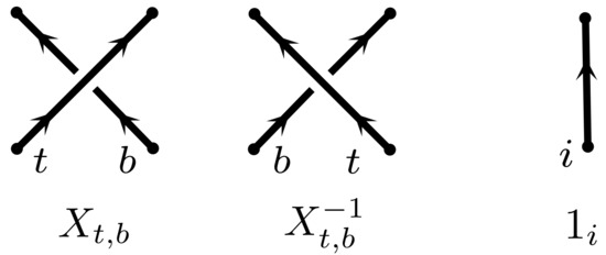 The simplest tangle diagram is perhaps the crossing-less strand with label i, denoted by . Next the positive crossing with t labeling the strand that is on top and b marking the strand that is at the bottom. Likewise the negative crossing with top strand t and bottom strand b is denoted , see Figure 4.