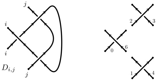For a tangle diagram D, we often list the labels of its strands as a subscript. For example the diagram shown in Figure 5 has two strands named i and j. In drawing pictures the labels are sometimes suppressed.