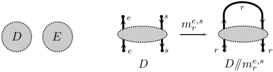 First we denote by the disjoint union of diagrams D and E. Second, denote by the diagram obtained from D by merging the end of strand e with the start of strand s, labelling the resulting strand r. By merging two strands we mean connecting them without introducing new crossings. D is also assumed to have strands labelled and no strand labelled r. Mergings may not always be defined but when the ends are close together merging them does make sense.