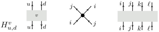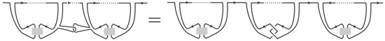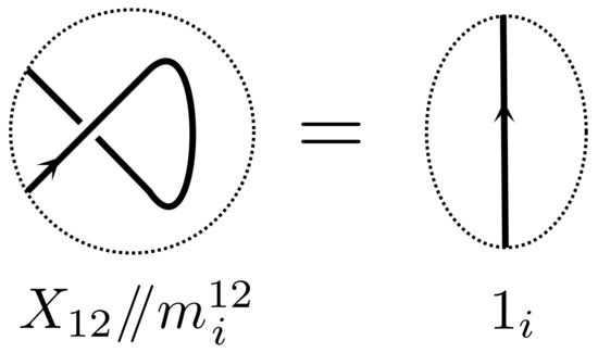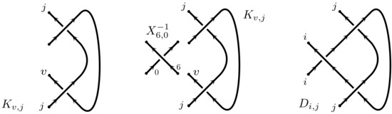 A H-tangle diagram is the same as a tangle diagram except that one more type of vertex is allowed called a H-contact, see Figure 11 (Left). Each H-contact carries a label. Our notation for the H-vertex is where u is the strand pointing upwards in the picture and d is the other strand. The superscript v denotes the label of the vertex.