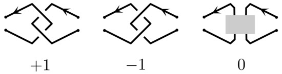 - Mostovoy, J.; Polyak, M. Encoding knots by clasp diagrams. arXiv 2019, arXiv:1911.02791. [Google Scholar]