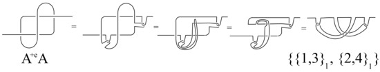 Here, means the partial derivative of A with respect to the variable and the notation means we should set both and to 0 and to and to . To see how this works in practice let us compute where is the tangle shown in Figure 5. It is efficient to start with the two-crossing tangle and then build by attaching the third crossing to K as follows (see also Figure 9)