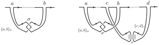 where are integers such that and . Given this data define a one-strand H-tangle diagram as follows. Starting with the x-axis oriented left to right, for each pair connect the points a and b with a contact of type σ as shown in Figure 21. Whenever the lines corresponding to pairs and will cross the contact is assumed to be in front. No other crossings appear.