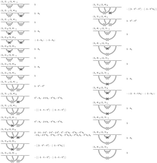 We end this section by listing all 27 gCT diagrams with at most two contacts, see Figure 24. For each diagram we also list its gCT notation. The hard contacts of a gCT diagram are always labelled in order of first appearance as one travels along the strand. For the i-th hard contact we used the variable in our expression for . Except for the pair of mirror image trefoil knots and diagrams with the same value of are in fact equivalent. It is well known that the Alexander polynomial does not distinguish mirror images of knots. The ambiguity in multiplication by a power of t has been used to make sure the lowest power of t is always .