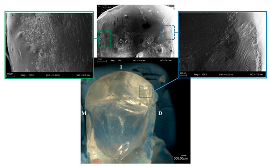 All 27 epoxy replicas of the restorations were carefully observed under the optical microscope (VHX-1000, Keyence, Itasca, IL, USA). Surface damage and irregularities (texture differences) were registered. Both were further characterized in a scanning electron microscope (SEM, SUPRA 40, Carl Zeiss, Thornwood, NY, USA). Prior to SEM examination, the epoxy replicas were sprayed with the scanning preparation CEREC® Optispray (Sirona Dental, Bensheim, Germany) for the acquisition of the digital images using the Planmeca Emerald™ intraoral scanner (Planmeca Emerald, Helsinki, Finland). The scans were recorded and exported from the Romexis software in STL format. The total area of surface damage found in each surface was analyzed using free and open-source software (3D Slicer 4.11.20210226, http://www.slicer.org/ (accessed on 20 July 2021)) for image analysis. Following this analysis, the epoxy-poured replicas were cleaned with enzymatic detergent (Patterson Multipurpose Enzyme Tablets, Patterson Dental, Saint Paul, MN, USA) followed by deionized water, both in an ultrasonic bath (Model 150T, Aqua Sonic, VWR scientific products, Radnor, PA, USA) to remove surface contamination. The epoxy replicas were air dried with an oil-free stream, sputter-coated with 4 nm gold (EM ACE-600, Leica Microsystems, Buffalo Grove, IL, USA) and observed under the SEM using a secondary electron detector. Twenty gold-coated, epoxy-poured replicas of the restorations were re-examined.