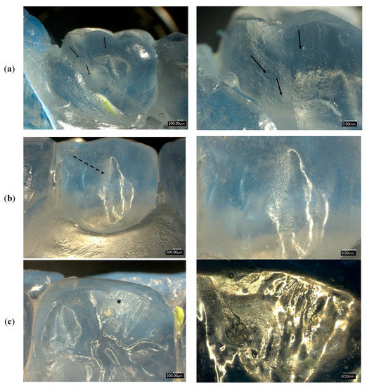 Three examples of the irregularities present in the resin epoxy replicas of the zirconia restorations. (a) Light scratches on the lingual surface of tooth #31. Black arrows run parallel to the scratches. (b) Dotted arrow points at the small pits on the facial surface of tooth #29. (c) Asterisk shows the irregularity on the occlusal surface relative to the facial cusps. Right images are at higher magnification to show details of the regions of interest indicated by the arrows and asterisk. For Figure (c), the gold-coated epoxy resin sample was observed under the optical microscope.