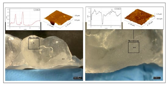 There was quite a bit of variability in surface roughness values (Ra) among the smooth and irregular surfaces that were analyzed. For instance, Figure 3 shows the difference in surface roughness between an identified smooth area versus another one with irregularities within the same surface. Some surfaces that were classified as smooth under the optical microscope had a surface roughness value in the range of 23.9–46.9 nm, while other smooth surfaces were in the range of 0.1–0.2 nm.