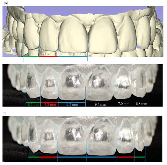 Visible width and width-to-height ratio measurements of the epoxy replicas of the anterior zirconia restorations from the facial view. (A) Original view of right and left central incisors, lateral incisors, and canines in 3D (top) and epoxy resin (bottom) model. The teeth did not follow the golden proportion. (B) Same image as (A), but digitally modified to fit the golden proportion. Lateral incisor now in the proportion of 1:1.618 with central incisor and 1:0.618 with canine; the size of the central incisor was maintained.