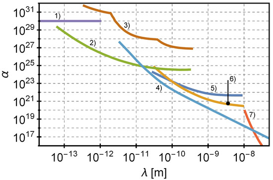 Here, we present neutron searches for exotic gravity as an example. Many theories beyond the Standard Model postulate short-range modifications to the -dependence of the Newtonian gravitational potential, such as the existence of compact extra dimensions of spacetime accessible only to the gravitational field [38,39,40] or the ∼100 m length scale of the density of dark energy [41]. A common experimental parameterization of modified gravity is the Yukawa potential [42], for which neutron-scattering currently gives the best constraints on for between m and m. Constraints have been made by analyzing the dependence of neutron–nucleus scattering lengths on neutron energy and target mass number [43], the angular distribution of neutrons scattered from noble gases [44,45], the energy dependence of neutron–nucleus cross-sections in lead [5,46], and very high-energy forward cross-section measurements at accelerator facilities [47].