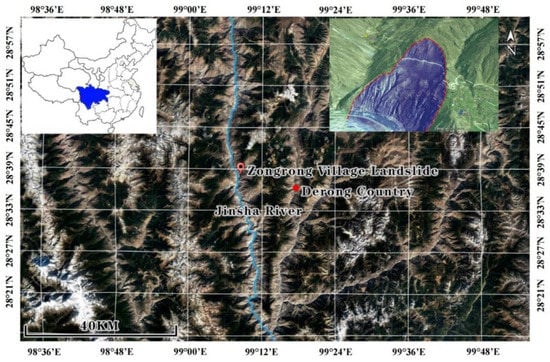 The Zongrong Village landslide is located 82 km upstream of the Jinsha River in Benzilan Town, on the left bank of the Jinsha River. The geological survey shows that the landslide is in the shape of an armchair, with a leading-edge elevation of 2145 m and a trailing-edge elevation of 2920 m. The left and right sides of the landslide each have a large gully, with the right having a blunt face towards Xu Long Township and the left gully facing Zongrong Village. The back wall of the landslide is steep, and the middle part of the landslide is gentle. The landslide front is a steep slope which is the shear outlet of the dumping deformation. The landslide area is shown in Figure 1.