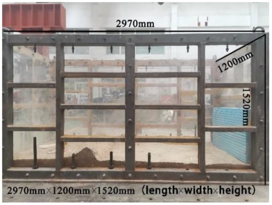 The shaking table model test was performed at the Laboratory of the West District of Beijing University of Technology, China. The table showed horizontal and unidirectional loading. The shaking table size was 3 m × 3 m, and the maximum load was 10 t. The operating frequency range was 0–50 Hz, the maximum displacement in the X and Y directions was ±120 mm, and the full-load acceleration was ±1.5 g. A rigid model box with the size 2.97 m × 1.2 m × 1.52 m (length × width × height) was used in the test. The outer frame was welded with Q235 steel pipes and surrounded by acrylic plates, which made it convenient to observe the changes in the model. A rubber cushion was added between the outer frame and the acrylic plate to protect the acrylic plate. The shake table and model boxes are shown in Figure 3.