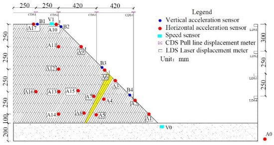 The test model monitoring device includes twenty-two acceleration sensors, two vibration-pickup devices, and eight displacement devices. All the sensors were arranged on the model’s longitudinal section to reduce the boundary effect on both sides. In the vertical direction inside the slope, five horizontal accelerometers were arranged to study the dynamic response law. Seven horizontal accelerometers and four vertical accelerometers were arranged from the slope’s toe to the slope’s top to study the dynamic response of the slope surface. Six horizontal accelerometers were arranged above and below the weak interlayer to study the effect on the dynamic slope response. Two vibration pickup devices were arranged at the top and toe of the slope. Four pull-line-displacement devices were arranged at the top, shoulder, middle, and near the toe of the slope, to monitor the slope settlement under the earthquake action. Four laser displacements were used to record the horizontal displacement of the slope at equal intervals on the slope surface. The specific sensor layout is shown in Figure 5.