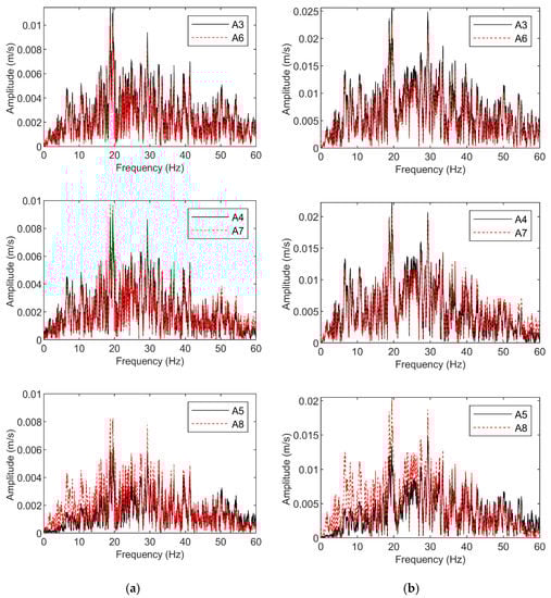 The Fourier spectrum reflects the spectral properties of ground motion and realises the conversion from the time domain to the frequency domain so that the degree of seismic response in each frequency band and the distribution of ground motion energy in each frequency range can be deeply studied []. A fast Fourier transform was used to obtain the Fourier diagram of the measuring points on both sides of the weak intercalated layer under the action of a 0.2 g Maoxian wave and a 0.6 g Maoxian wave. The results are shown in Figure 18.