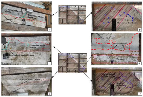During the test, the deformation of the slope was observed for approximately 10 min each time the first seismic wave was loaded, and the deformation was recorded using mobile phones and cameras. The slope’s crack development process before the occurrence of overall instability are shown in Figure 19.