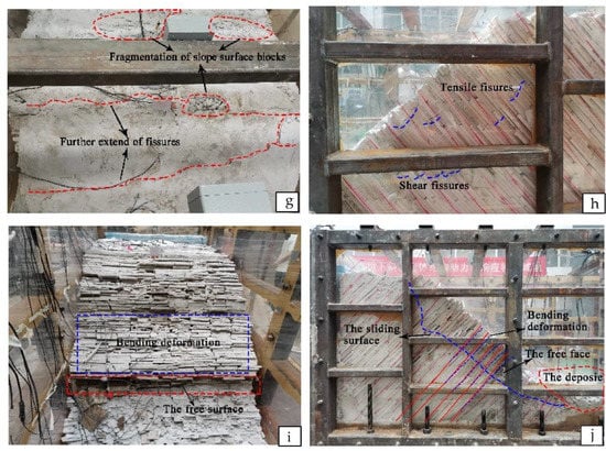 When the seismic wave was less than 0.3 g, the slope had no apparent deformation or failure. When the seismic wave reached 0.3 g, transverse tensile cracks and longitudinal cracks appeared at the slope’s top, and compression shear microcracks occurred at the slope’s toe (Figure 19a,b). When the seismic wave amplitude reached 0.5 g, the transverse tensile cracks extended from the slope’s top to the slope’s back edge and the slope’s shoulder, and the longitudinal cracks at the slope’s top connected two transverse tensile cracks (Figure 19c,e). The cracks at the toe of the slope extended further, showing a trend of connecting with each other and developing upward along the slope, and bending deformation occurred on both sides of the toe of the slope (Figure 19d,f). When the amplitude of the seismic wave was 0.6 g–0.7 g, the tensile cracks at the top and middle of the slope extended to the lower part (Figure 19h); the surface cracks at the toe of the slope developed, and blocks slid on both sides of the slope toe, as well as at the shoulder and middle of the slope (Figure 19g). When the seismic wave amplitude reached 0.8 g, the block at the slope’s toe formed a penetrating crack, the block slipped, the soft structural plane bent and broke, and a large number of slope-surface blocks slid and accumulated at the slope’s toe, resulting in a river-blocking disaster (Figure 19i). At the same time, shear cracks at the slope’s toe further developed upward. Under the action of seismic waves (0.9 g–1.0 g), blocks at the slope’s toe slipped to form a temporary surface, resulting in bending deformation at the slope’s upper part. In the slope, the upper tensile cracks and the lower shear cracks formed a transfixed sliding surface, the main sliding surface was formed, and slope instability failure occurred (Figure 19j).