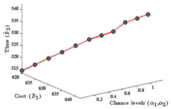In Model (17), the target values for the first two constraints are respectively represented as and . and are the predetermined confidence levels for the first and second constraints, respectively. Furthermore, as far as the determination of the MST for is concerned, the first constraint specifies the total incurred -cost while traversing between the cities at the chance level , and the second constraint characterizes the overall -travel time spent while traversing between the cities with respect to the chance level .