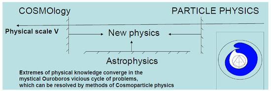 The data of precision cosmology favor now-standard inflationary cosmology with baryosynthesis and dark matter/energy [3,4,20,21,22,23,25,26,27,28,29]. This standard cosmological paradigm involves physics beyond the Standard model (BSM) with new physical scale V, which is accessible for combined probes by cosmological, astrophysical and experimental physical means as illustrated on Figure 1.