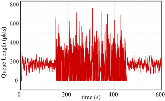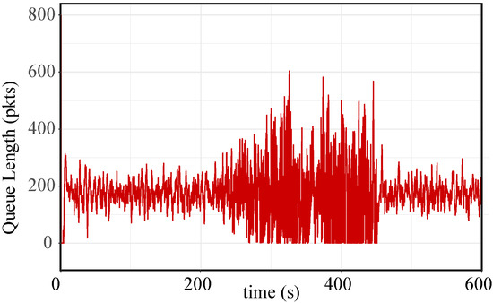 A typical star topology of the TCP/IP network consisting of a number of hosts and clients with one network gateway is considered in the study. There are N source agents and destination agents being created to represent the hosts and clients in the network, respectively, where . The ‘newreno tcp’ agents are used for the sources with ‘ftp’ connections to generate long-lived TCP flows to the destination clients. The maximum value of in each ‘tcp’ agent is set to be the same as Mb. The link capacity C of the network gateway router is set to be 15 Mb. Moreover, the packet size is set to be 500 bytes. The connections between each host/client and the router are set by ‘full-duplex’, which construct bi-directional links at propagation delay ms. The proportional integral (PI) AQM mechanism is applied to regulate the queue length (QL) at a desired value of packets in router buffer [41]. The capacity of router buffer is set to be 800 packets. A traffic trace generates payload bursts according to the given trace file of the DDoS attack profile from the CAIDA Dataset. In the network simulator, traffic trace is implemented by using the C++ class ‘TrafficTrace’, which is bound to the specified real DDoS attack traffic trace file in the OTcl domain.