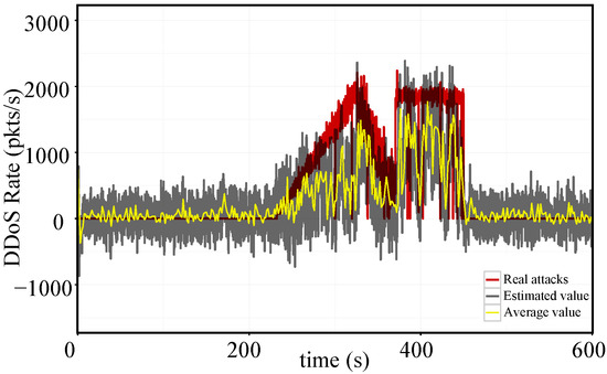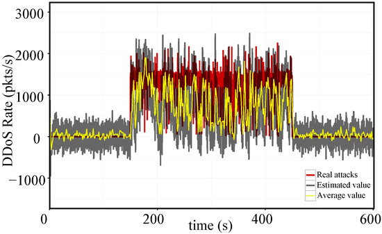 In addition to forcing the estimation error to zero in the finite-time, the other aim is to speed up the convergence of the internal dynamics of the error system (16) for precision estimation to meet the real-time criteria. By Theorem 2, the internal dynamics, i.e., the estimation error , is forced to the defined area (24) in the finite-time and then converges to zero asymptotically. As presented in Figure 3 and Figure 6, the congestion window is accurately estimated, which reflects the serious degradations in sending rate, throuput and bandwidth utilization in the networks when the DDoS attacks started in the scenario. From the Theorem 3, the dynamics of ATF, i.e., , which is represented by the increasing rate attack profile and the subgroup attack profile from the CAIDA datasets, is quickly and exactly estimated. The results of the estimated dynamics of DDoS rate are depicted in Figure 4 and Figure 7.