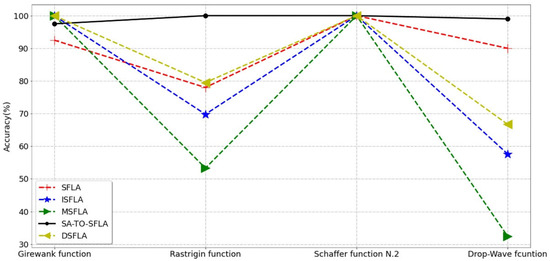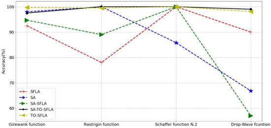 i. Convergence accuracy analysis. From Figure 4, it can be seen that TO-SFLA and SA-TO-SFLA with threshold oscillation strategy can achieve convergence accuracy of more than 97.5% in four test functions with increasing difficulty level in turn. While maintaining a high accuracy, the accuracy curve is extremely stable. Additionally, obviously, with the increasing complexity of functions, the accuracy of SA-TO-SFLA is still high, while the accuracy of TO-SFLA has begun to show a downward trend. The curve of the SFLA has greater volatility, and its performance is the worst on the Girewank function. It can be seen from Figure 3a that, although the function has only four local optimas, the difference between the local optimas and the global optima is very small, which leads to the SFLA often converging with the local optimas due to the lack of a strong enough jump out mechanism. However, on the Rastringin function, it can be seen from Figure 3b that there appears a large number of local optimas, and the global optima are surrounded by multiple identical local optimas, which has strong confusion for SFLA and SA-SFLA, and making the algorithm often fall into the local optimas as shown in Figure 3c. On Schaffer N.2, each algorithm performs better. In the drop-wave function, as the function fluctuates violently, the convergence of the algorithm takes a long time, and there are many iterations. Therefore, before the algorithm finds the global optima, the temperature of the simulated annealing strategy has dropped to the extent that it is not able to accept the inferior quality. However, the simulated annealing strategy cannot jump out or has not yet converged in the specified round in the early stage due to receiving a large number of poor solutions. On the contrary, it has a restraining effect on the algorithm, which leads to a significant decrease in the accuracy of the algorithm.