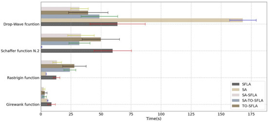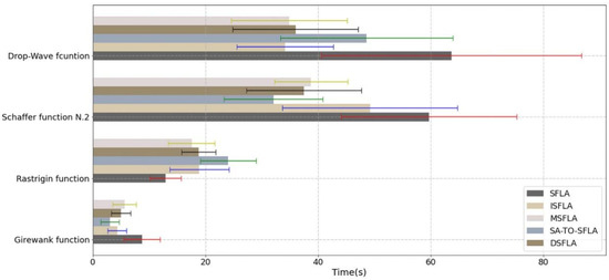 ii. Convergence time analysis. As can be seen from Figure 5, in the Girewank function, SFLA takes the longest time to find convergence, which is the same as above. In this function, there are four identical local optimas approximate to the global optima, which makes the frog in the algorithm jump back and forth among multiple optima and prolong the convergence time, while other algorithms have similar time-consuming issues. In the Rastrigin function, the convergence time of SFLA and SA-SFLA is better than that of TO-SFLA and SA-TO-SFLA, as when testing with SFLA or SA-SFLA, at the later stage of convergence, all frog individuals gather around a point (the global optima or local optimas), while the TO-SFLA and SA-TO-SA divide a certain proportion of subpopulation to implement the oscillation strategy, and the remaining subpopulations converge. By comparing that, the number of frogs converging in the TO-SFLA and SA-TO-SFLA is less than that in the SFLA and SA-SFLA, so the convergence time of the TO-SFLA and SA-TO-SFLA increases slightly. However, SA-TO-SFLA can jump out of local optima solutions faster than TO-SFLA due to the simulated annealing strategy in the early stage, so SA-TO-SFLA is faster than TO-SFLA. In Schaffer function N.2 and drop-wave functions, SFLA needs to spend a lot of time jumping between different local optimas. The convergence time of SA-TO-SFLA and SA-SFLA tested on Schaffer N.2 function is similar, as only the central region of the function has a large range of violent fluctuations. Relying on the poor solution acceptability of simulated annealing strategy, a frog population can quickly converge to the central region, and the central global optima is in a large range. Thus, it provides a good convergence direction for both algorithms, which makes the convergence time short. However, TO-SFLA does not have the global acceptability of poor solutions of simulated annealing strategy in the early stage, so it will spend more time on some local optimas, which makes the convergence time long. In the drop-wave function, the convergence time of TO-SFLA is shorter than that of SA-TO-SFLA, while SA-SFLA still maintains a shorter convergence time. However, it can be seen from Figure 4 that the convergence accuracy of both algorithms has decreased, as the algorithm falls into the local optimas, and the convergence time is decreased by sacrificing the convergence accuracy.