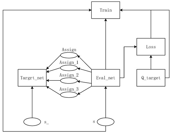 The structure of the DQN algorithm is shown in Figure 2. s (state) represents the current cycle step, r (reward) represents the reward value generated by the current cycle step, a(action) represents the behavior caused according to the current cycle step state, and s_(next State) represents the next cycle step. Target_net and Eval_net refer to Q_target and Q_eval, respectively. Parameters of Eval_net are deferred to parameters in Target_net. Q_target and Q_eval represent the two neural networks of the DQN algorithm, which follows Q-learning, the predecessor of the DQN algorithm. They are not much different, just different parameters. Q_eval contains behavioral parameters, and theoretical behavior is bound to deviate from actual conduct (loss). Thus, in the traditional DQN algorithm, parameters s, loss, and symmetric Q_target and Q_eval will affect the Train value.