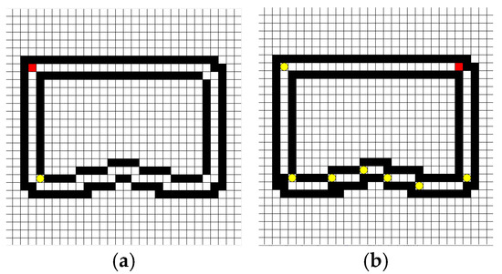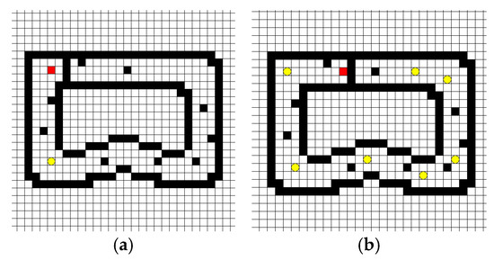 The paper is modeling as described in Section 3.2 and the characteristics of map symmetry are shown in Figure 5a. The red point represents the starting point of the robot, which can change as needed. The yellow point represents the target point, and the next target point will generate after the robot reaches it until it runs a full lap. The black points represent obstacles or track boundaries. The state of the final phase is shown in Figure 5b. The last target point is in the same position as the start of the first stage.