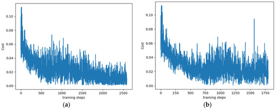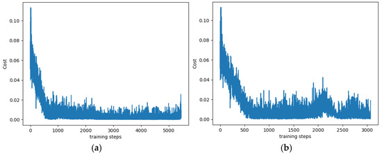Although the improved objective function and reward value function reduces the convergence speed of the algorithm, the corresponding loss function slightly increases. The analysis results show that because the particular reward and punishment value of 0.5 set in the above experiment is too large, the accumulation speed of the reward and punishment value of the patrol robot is too fast, which makes the patrol robot have serious interference in the judgment of the later stage. Therefore, the following modifications are made in this paper, which is the special reward and punishment value 0.5 is changed to , and it only affects the initial learning, adjusted to 0 after training. The training-loss function generated by the modified algorithm is shown in Figure 8. Figure 8a represents the change curve of the training-loss function obtained when the value of is forever. Figure 8b illustrates the corresponding change curve obtained when the value of is at the initial stage of the experiment and 0 at the later stage of the investigation. Compared with the improved algorithm before, the training times of the two algorithms are increased, which is caused by the sharp decrease of the particular reward and punishment value . However, by comparison, the convergence speed of the optimized algorithm with changing value is about 40% less than that of the algorithm with unchanged value. The number of training times is less than 500, which belongs to the initial training stage. The patrol robot is in the stage of exploration and learning and fails to make a correct judgment on obstacles. The loss value is still large, but both algorithms have a downward trend, which the loss function of the algorithm with value changing declines earlier. When the number of training reaches 500 times, both algorithms tend to balance, and the algorithm with changed value has fewer training times, which means that the improved DQN algorithm with changed value can complete the training faster, and the patrol robot can avoid obstacles and reach the target point more quickly. The feasibility of the improved algorithm is further verified.