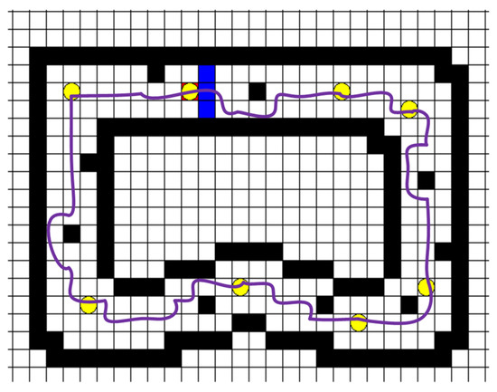 After several rounds of learning according to the improved algorithm, the patrol robot patrols according to the route shown in Figure 9. If the improved algorithm is not used, the patrol robot is prone to an infinite loop at the yellow target point in the lower-left corner of Figure 9, thus unable to complete the walking task. Because this algorithm is cyclic, no matter which small segment of the target point to take a screenshot will contain part of the obstacle point. Figure 9 is the final part of the target point of the algorithm in the whole circle. The corresponding obstacle point of the last part will be displayed, and other screenshots will also contain the related obstacle point. To distinguish, the transformation of the obstacle points is especially changed to blue.