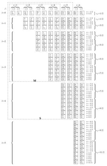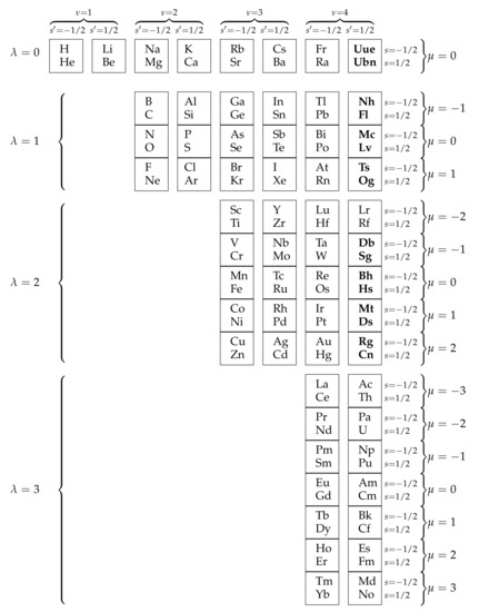 - Thyssen, P.; Ceulemans, A. Particular Symmetries: Group Theory of the Periodic System. Substantia 2020, 4, 7–22. [Google Scholar]