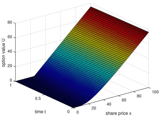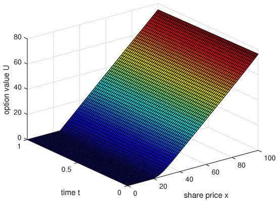 Equation (1) is a partial differential equation used for pricing options. The function is the European call option price with asset price x and time t. T is the maturity, K is the price of strike, is the risk-free interest rate, and is the volatility function of the underlying asset and time. When the coefficients are constant functions, we get the classical Black–Scholes model. Following [2] we consider the above model on a truncated domain , where is a suitably chosen positive number so that