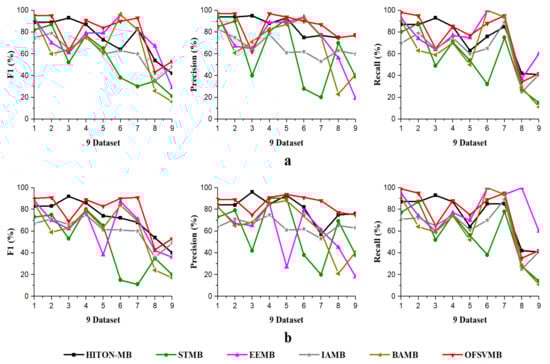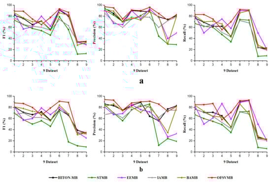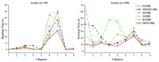 In a dense dataset with a sample size of 5000, such as the Barley, the EEMB is more accurate in terms of F1 and recall at a significant level of 0.01 and 0.05, as shown in Table 7 in bold and in Figure 3a,b. Still, OFSVMB is more accurate in terms of precision at a significance level of 0.01 and 0.05 than EEMB and runs faster than others, as shown in Figure 4. While on the Mildew dataset, the OFSVMB is more accurate than IAMB, STMB, BAMB, and EEMB. The HITON-MB is more accurate than OFSVMB in terms of precision at a significance level of 0.05, while comparable accuracy in terms of precision at a significance level of 0.01, as shown in Table 7 in bold and in Figure 3a,b and runs faster than other algorithms as shown in Figure 4.