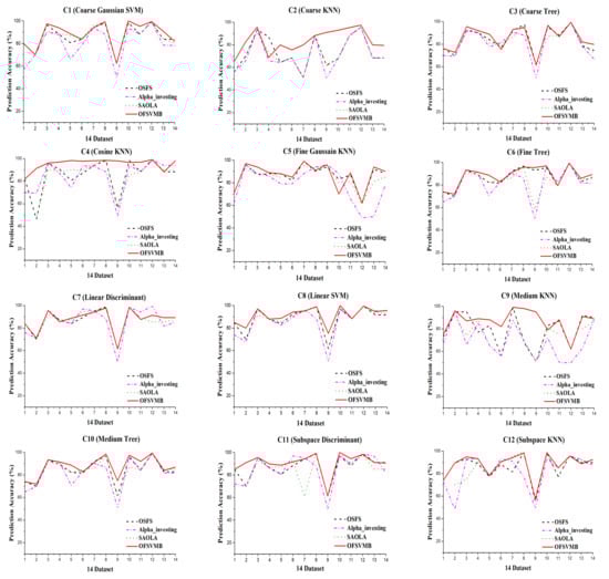 The number of selected features and the prediction accuracy of OFSVMB on 14 real-world datasets with low to high dimensionality is conducted using 12 classifiers including C1 = Coarse Gaussian SVM, C2 = Coarse KNN, C3 = Coarse Tree, C4 = Cosine KNN, C5 = Fine Gaussian SVM, C6 = Fine Tree, C7 = Linear Discriminant, C8 = Linear SVM, C9 = Medium KNN, C10 = Medium Tree, C11 = Subspace Discriminant, and C12 = Subspace KNN, where C standards for classifier and saving space in Table 8, Table 9, Table 10 and Table 11, the abbreviation is used with numbers. For all the datasets, cross-validation is used 10-fold to prevent bias in error estimation. Moreover, the selected number of features and running time in seconds are also reported to show the efficiency of the algorithms.