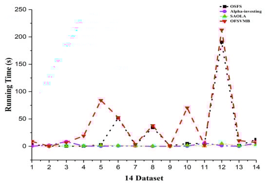 The running time of OSFS is slower than Alpha-investing and SAOLA on many datasets because it considers features repeatedly to add or remove them from the feature set. The OFSVMB selects many features from many datasets and causes its running time to be slower than other algorithms, as shown in Figure 6. The OFSVMB searches for the PC and Spouse of the target feature T, while OSFS, Alpha-investing, and SAOLA only search the PC set of the target feature T.
