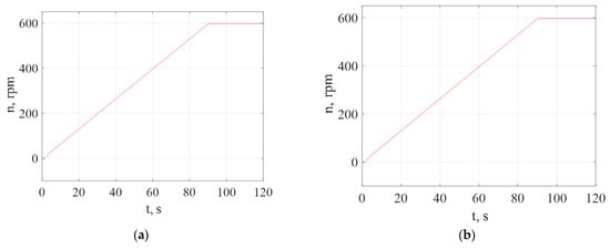 Starting characteristics of the rotation frequency of the traction motor under scalar control: (a) when the motor is operating in normal mode; (b) if the stator phase A winding is damaged; (c) in the presence of asymmetry in phase B of the power supply system; (d) in case of damage to the stator phase A winding and the presence of asymmetry in phase B of the power supply system at the same time.